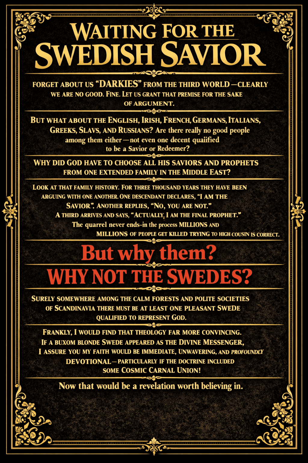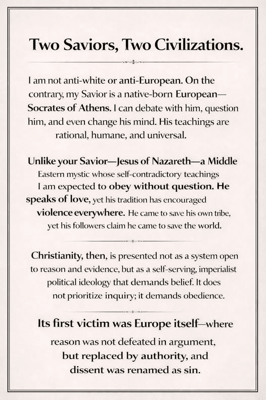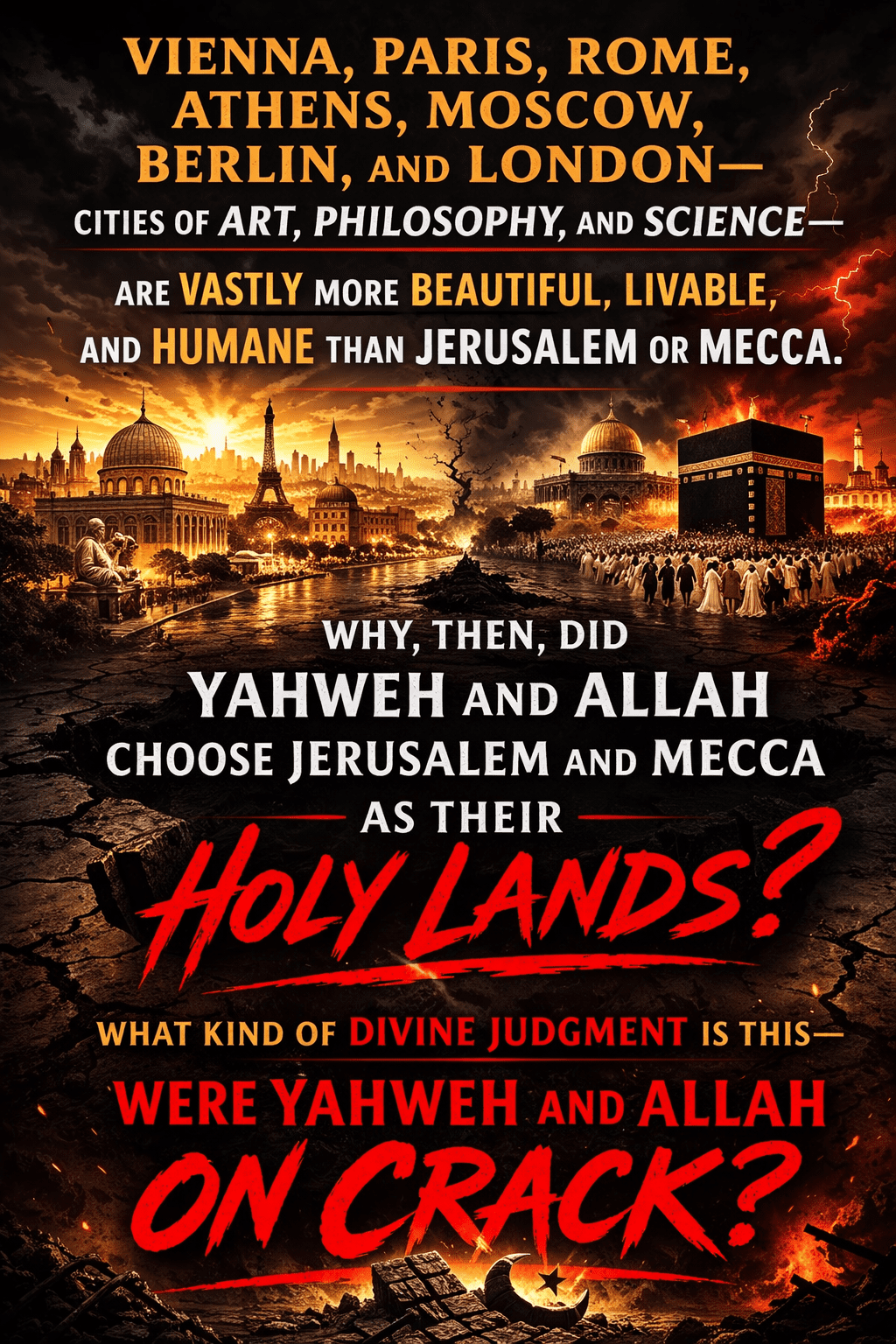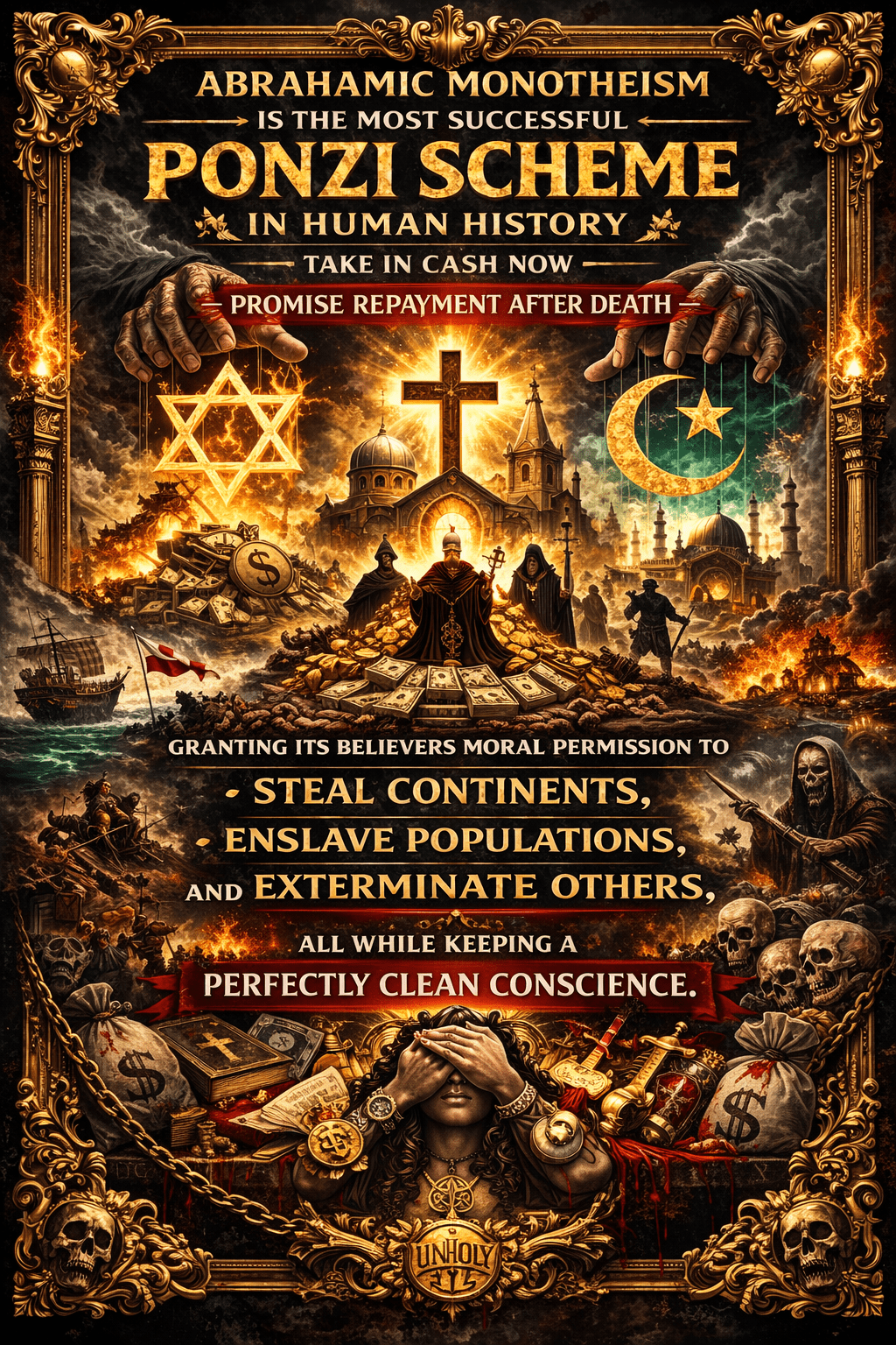Every Abrahamic religion is built on this same rotten foundation. A private conviction is inflated into cosmic law. A tribal story is inflated into a universal narrative. A psychological need is inflated into eternal truth. The believer convinces himself that his belief is the universe, and then demands that the universe bow down to his belief. This is not piety. It is narcissism dressed in scripture. The deception is not small. It is planetary. It is civilizational. It is cosmic. It rewires reality to suit the believer’s imagination. It trains him to confuse faith with fact, allegiance with truth, and domination with righteousness. And once that confusion becomes normal, violence becomes a sacrament. The believer cannot be wrong, because wrongness would collapse the illusion. He cannot compromise, because compromise would admit uncertainty. He cannot coexist, because coexistence would equalize him with others. His “truth” survives only through conquest, so every rival becomes a threat that must be crushed. This is why Abrahamic religions do not solve conflicts; they create them. They need the Other. Without an enemy, their identity evaporates. The Other validates their superiority. The Other confirms their chosen-ness. The Other justifies their violence. As long as someone exists outside their belief system, there will never be peace — because peace would destroy the psychological engine that powers the entire worldview. And so they conquered the ancient world with the same brutal arithmetic: if there is only one truth, then everything else must die. Europe’s pagan civilizations were erased until nothing remained but ruins under church floors. Egypt’s sacred traditions, older than any Abrahamic book, were suffocated under a theology incapable of respecting anything it did not create. Persia’s philosophical and spiritual worlds were strangled by the demand that one prophet must be final. Central Asia’s pluralism was smashed. South Asia was attacked again and again by a worldview incapable of understanding plurality as anything but blasphemy. The Indigenous civilizations of the Americas were exterminated under the pretense of salvation, as if salvation were a gift and not a weapon. The destruction was not a tragedy; it was the intended function. Abrahamic monotheism spreads like a virus engineered to kill everything that refuses to become a clone of itself. It has no mechanism for coexistence. It cannot share. It cannot tolerate. It cannot imagine a world where difference is not sin. A system that believes only one truth may exist cannot allow any other truth to survive. But the most revealing part is not what it did to the rest of the world. The most revealing part is what it does to itself. Once non-believing civilizations were crushed, once the external world was conquered or annihilated, Abrahamic monotheism did not achieve peace. It simply ran out of victims. And a machine that runs on purging cannot stop just because the world is empty. When there are no external Others left to destroy, it manufactures internal Others — and the cannibalism begins. Judaism split into warring sects the moment external threats faded. Christianity, after bulldozing the pagan world, immediately collapsed into violent schisms: Orthodox against Catholic, Catholic against Protestant, Protestant against Protestant. Each group claimed sole ownership of the same unverifiable revelation and slaughtered anyone who challenged that claim. Islam, after tearing through Persia, North Africa, and Central Asia, disintegrated into Sunni against Shia, Shia against Shia, Sunni against Sunni, and every variation in between. The blood never dried long enough for reflection. This internal self-destruction is not a malfunction. It is the logical endpoint of the doctrine. A worldview built on exclusivity must exclude even its own members. A worldview built on purity must purify itself endlessly. A worldview built on supremacy must always find someone inferior — even if it must invent inferiority inside its own walls. The system must always be killing something. When it cannot find unbelievers outside itself, it hunts for unbelievers inside itself. Abrahamic monotheism does not merely consume the world; it consumes itself. It is cannibalistic at the level of its DNA. It cannot survive peace because peace removes the fuel that keeps the illusion alive. Without enemies, the believer begins to look inward — and the same ruthless logic he once used to erase civilizations suddenly turns against his own community, his own sect, his own family, his own mind. The fire that once burned the world begins to burn its own structure. This is the final truth behind the deception: a worldview that demands annihilation will eventually annihilate itself. A system that refuses plurality will eventually refuse its own plurality. A doctrine that demands purity will eventually tear apart its own body in search of impurity. A religion that insists only one truth may exist ultimately shatters into endless fragments — each fragment insisting it alone is correct, each fragment prepared to kill to defend its claim. Abrahamic monotheism is not a path to peace. It is not a spiritual philosophy. It is a self-replicating engine of conflict that begins by destroying the world around it and ends by destroying itself. It is a cannibal god demanding endless sacrifice — first of civilizations, then of cultures, then of sects, then of families, then of believers, then of itself. This is not a metaphor. This is the design. The Cannibal God does not stop eating. It only runs out of food.