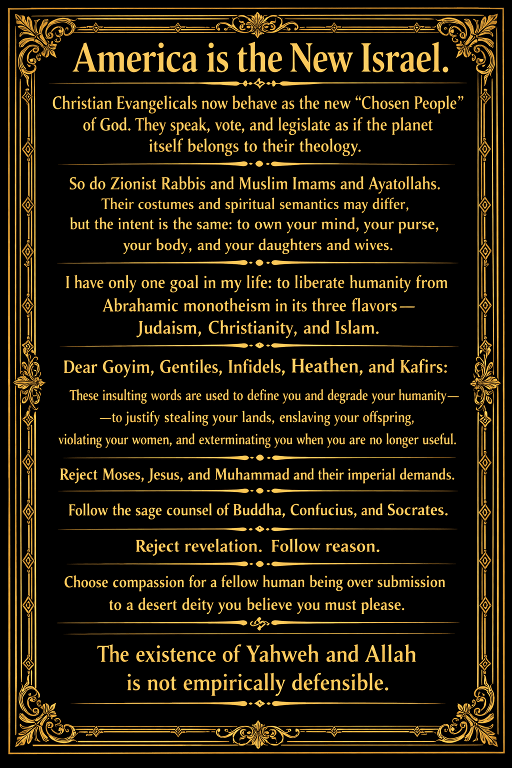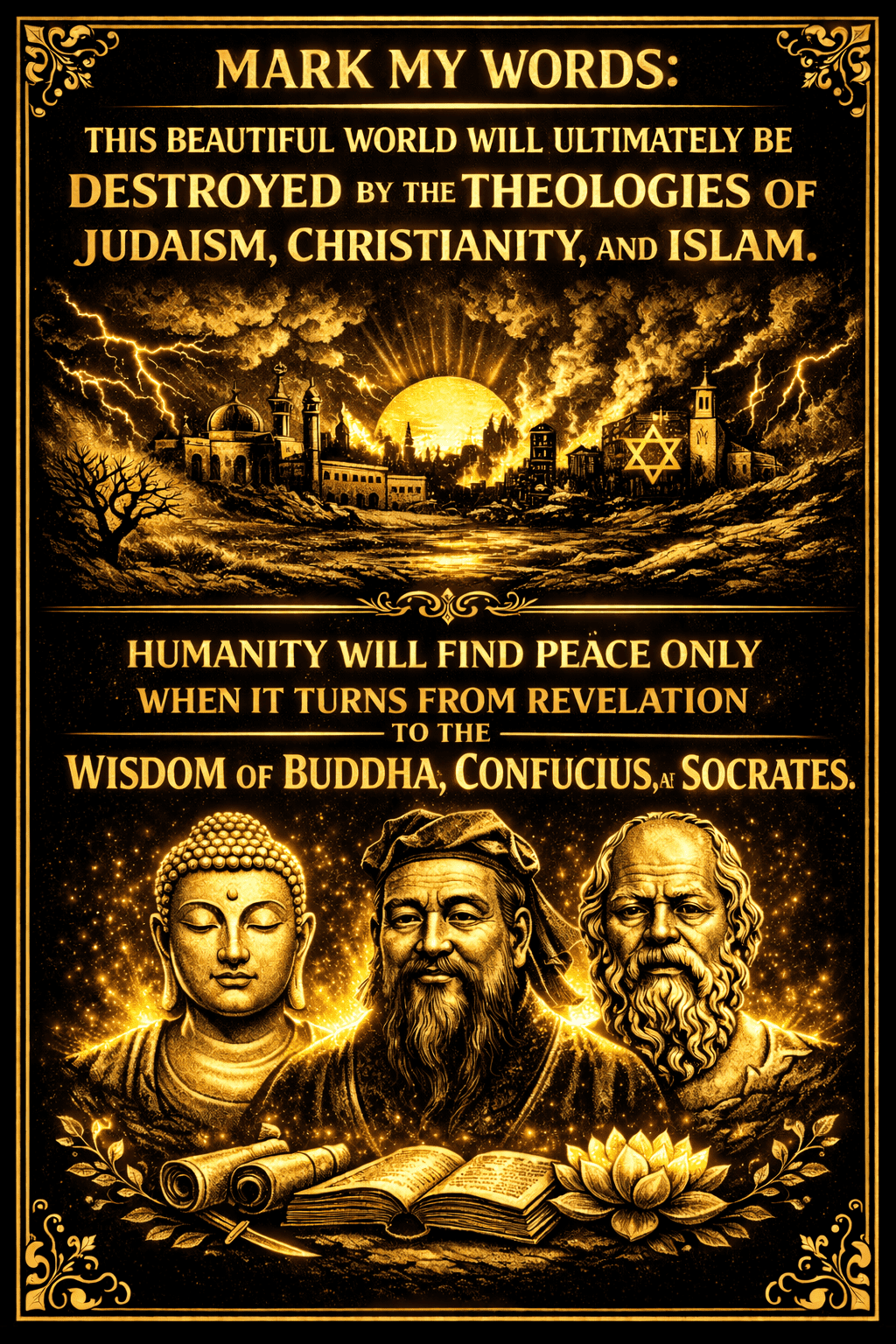 Abrahamic monotheism begins with a lie so enormous that it doesn’t merely distort the world — it replaces it with a hallucination. It declares that one God, one revelation, one path, and one truth define the entire universe. None of these claims can be verified. None can be demonstrated. None can survive a moment of scrutiny. They are empty assertions, shouted loudly enough and enforced violently enough to become “sacred.” What they call truth is nothing more than belief. What they call belief is nothing more than self-interest. And what they call self-interest is nothing but a justification for violence.
